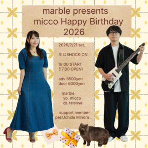 marble presents 「Happy Century, Birthday Live☆ 〜micco & Tatsuya 合同お誕生日会〜」 @川口SHOCK ON チケット販売URL↓ https://www.shock-on.jp/schedules/2024/02/10/3861/ 場所 川口SHOCK ON 公演日2024年2月10日 Open17:00 Start18:00 Charge 当日予約¥5,500(税込¥6,050) 予約¥5,000(税込¥5,500) 【 +1drink+1food別途オーダー】※当日限定スペシャルメニューあり! 出演 [marble] vo : micco gt : 菊池達也 [support member] perc : 川口伸王 key : 小泉"pat"一郎